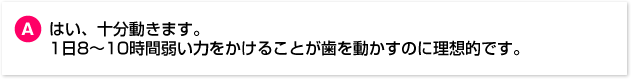 マウスピースを入れることにより歯に弱い力をかける。この場合の弱い力とは舌で歯を押す程度の力で充分です。