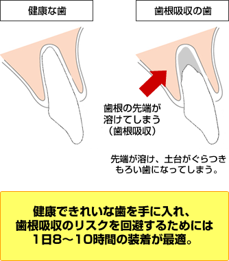 しかし、あまりに強い力をかけたり、長時間力をかけ続けると、骨が溶けすぎたり、歯根が溶けたりする(歯根吸収)してしまいます。